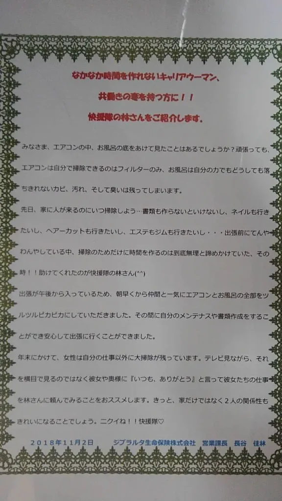 エアコン内部やお風呂の底は、自分では落としきれない汚れや臭いが残りがち。私も出張前で時間がまったく取れず、掃除を諦めかけていた時に助けてくれたのが林さんでした。朝早くから仲間と一緒にエアコンとお風呂を一気にピカピカに。私はその間、自分のメンテナンスや書類作成ができ、安心して出張へ向かえました。